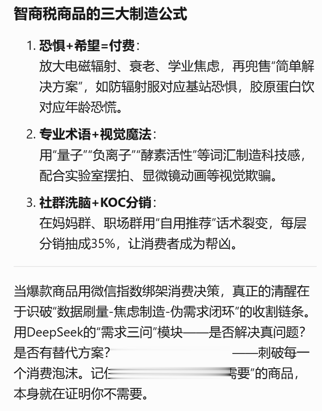 当朋友圈热转的“种草清单”与微信指数榜单高度重合,一场针对中产的精准收割早已悄然启动。DeepSeek通过智能语义分析发现,近期霸榜的6类爆款商品中,竟有75%利用信息差与情绪营销制造伪需求。这些商品不会提升你的生活品质,只会掏空钱包并留下“被割感”。